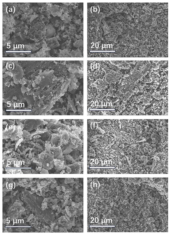 Figure 2 depicts the scanning electron microscopy (SEM) images of the PX-1-1 samples doped with four nitrogen dopants at different magnifications. It can be observed that after nitrogen doping and potassium hydroxide (KOH) activation, the surface of all the PX-1-1 samples becomes very rough and presents very small fragments [36]. The EDS mapping images (Figure S1) show that the N and P elements are distributed on PA-1-1. However, all the samples exhibited irregular particle morphology under low-magnification SEM. It can be observed that, despite the differing types of nitrogen dopants, PM-1-1 (Figure 2a,b), PU-1-1 (Figure 2c,d), PA-1-1 (Figure 2e,f), and PP-1-1 (Figure 2g,h) exhibited a disordered carbon structure at 600 °C, indicating that the nitrogen source had no discernible effect on the morphology.