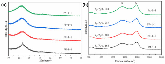Figure 3a illustrates the XRD spectra of the PX-1-1 materials with varying types of nitrogen dopants at a fixed KOH dosage of KOH: PX = 1:1 (mass ratio). It can be observed that all the samples exhibit significant broad diffraction peaks in the range of 20–30°, indicating that the prepared samples have disordered carbon structures. Furthermore, no additional impurity peaks were observed in the graph, indicating that impurities can be effectively removed through acid washing. The lattice defects and morphology of the material were analyzed using Raman characterization testing. As illustrated in Figure 3b, all the samples exhibit two pronounced peaks at approximately 1350 cm−1 and 1590 cm−1, corresponding to the D and G bands, respectively. The D peak represents a defect in the C atom crystal and the G peak represents an in-plane stretching vibration of the sp2 hybridization of the C atom. Consequently, the magnitude of the IG/ID values can be employed to facilitate the comparison of the degree of defects in different materials [37]. The IG/ID values also exhibit different values when different nitrogen dopants are employed, indicating that the introduction of different dopants can result in alterations to the size of the defect layer [38]. The PA-1-1 sample exhibited the lowest IG/ID value (1.224), indicating that this ammonium dihydrogen phosphate-doped sample has a greater number of defect sites and a thicker graphitization layer, which is more conducive to electrochemical energy storage [39].