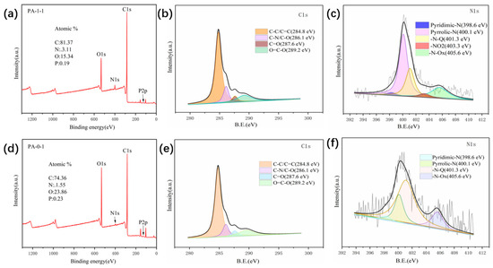 Wide-scan XPS spectrum of (a) PA-1-1. XPS spectrum of PA-1-1 for (b) C 1s and (c) N 1s regions. Wide-scan XPS spectrum of (d) PA−0−1. XPS spectrum of PA−0−1 for (e) C 1s and (f) N 1s regions.
