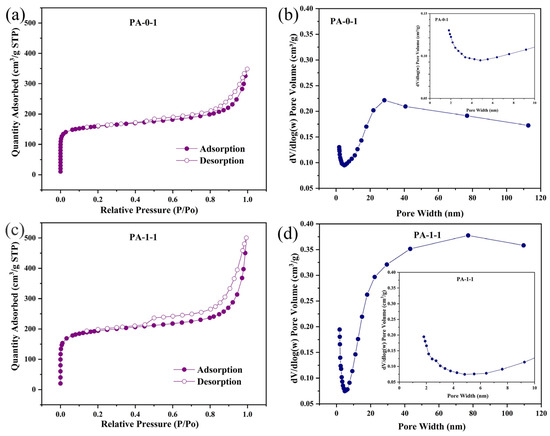 N2 adsorption-desorption isotherms of (a) PA−0−1, the pore size distribution of (b) PA−0−1, N2 adsorption-desorption isotherms of (c) PA-1-1 and pore size distribution of (d) PA-1-1.