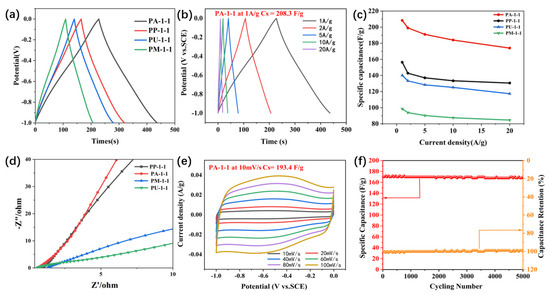 The electrochemical performance of the PX-1-1 electrodes was investigated in a three-electrode system with a potential window between −1 and 0 V with 6 M KOH as the aqueous electrolyte, given its high ionic conductivity and small radius of the hydration sphere (3.00 Å for OH− and 3.31 Å for K+) [46]. Figure 6a presents a summary of the GCD curve of the PX-1-1 electrode at a current density of 1 A/g. All the GCD curves exhibit a relatively symmetrical profile, indicative of optimal coulombic efficiency and capacitive properties [47]. In particular, the PA-1-1 electrode exhibited a longer discharge time, which can be taken to imply that it has an excellent capacitance. At a current density of 1 A/g, the calculated specific capacitances of the PM-1-1, PU-1-1, PP-1-1, and PA-1-1 electrodes are 97.9, 139.7, 155.6, and 208.3 F/g, respectively. The GCD curves of the PX-1-1 electrodes at different constant current densities, ranging from 1A/g to 20A/g, are shown in Figure 6b and Figure S4a–d. It can be observed that the GCD curves of all these samples exhibit a relatively triangular and symmetric shape. Furthermore, a minor discrepancy can be observed between the charging/discharging curve and the straight line, which can be attributed to the ohmic resistance of the electrode or the pseudo-capacitance generated by the functional groups on the surface of the electrode materials [48]. These findings suggest that all the prepared PX-1-1 electrodes exhibit satisfactory reversible charge/discharge properties. However, the incorporation of ammonium dihydrogen phosphate appears to be more effective than other nitrogen dopants in enhancing the electrochemical performance of the electrode materials. The corresponding rate performance based on the GCD data is presented in Figure 6c. Clearly, the PA-1-1 electrode delivered an excellent rate performance with a capacitance of 208.3, 199.0, 191.0, and 184.0 F/g at 1, 2, 5, and 10 A/g. Even at a current density of 20 A/g, a capacitance of 174 F/g can be achieved, which is much higher than that of PP-1-1 (130.6 F/g), PU-1-1 (117.3 F/g), and PM-1-1 (84.6 F/g).