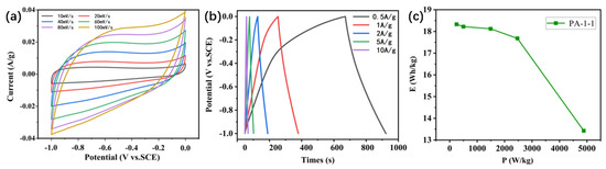 To assess the practical applicability of the as-prepared biomass-based carbon electrode materials, the electrochemical performance of the PA-1-1//PA-1-1 symmetrical supercapacitor (SSC) was evaluated in a 6 M KOH electrolyte [67]. The CV curves of PA-1-1 at varying scan rates (10 mV/s to 100 mV/s) are presented in Figure 7a. It can be observed that the shape of the CV curves undergoes a gradual deformation with the increase in the scanning rate, while the CV curve still exhibits a quasi-rectangular shape with approximately mirror symmetry at a high scanning rate of 100 mV/s, indicating that the electrode exhibited ideal electrochemical capacitive behavior [68]. Figure 7b illustrates the GCD curves of PA-1-1 in a current density range from 0.5 to 10 A/g, exhibiting a triangular and symmetrical shape. This further confirms the ideal capacitive behavior of PA-1-1. Figure 7c presents the Ragone plot of PA-1-1//PA-1-1 SSC. The SSC achieved a maximum energy density of 18.33 Wh/kg at a power density of 249.57 W/kg, and an energy density of 13.43 Wh/kg at a maximum power density of 4882.83 W/kg.