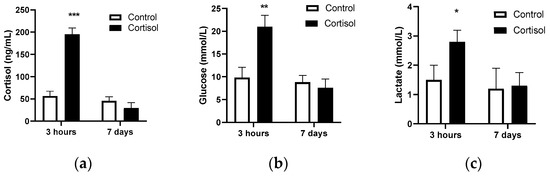 Assessment of physiological response to stress: cortisol (a), glucose (b), and lactate (c) in plasma were assessed in juvenile rainbow trout kept under cortisol and control 3 h and 7 days after treatment. The results are expressed as means and + standard errors (n = 5 per treatment). Differences between control and stress groups are shown in * p < 0.05, ** p < 0.01, *** p < 0.005.