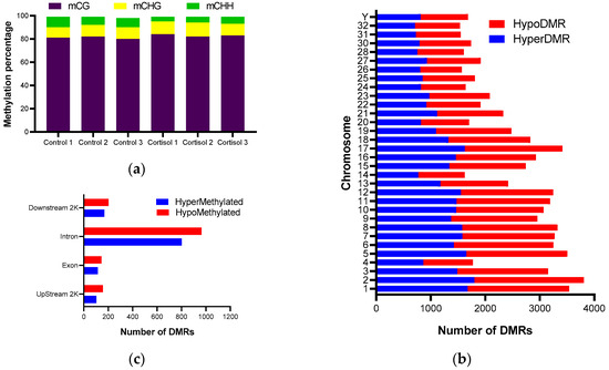 Methylated cytosine in the six libraries was CG, CHG, and CHH, where H represents A, T, or C. The average methylation level of CG, CHG, and CHH were 82.32%, 10.84%, and 6.85%, respectively (Figure 3a). Considering that methylation in GC sites is present in a greater proportion, the analyses of differential methylation and its relationship to gene expression were carried out based on the context of GC methylation. Methylation analysis revealed that 79,605 DMRs were present in the 32 annotated chromosomes (Supplementary Table S2). Chromosome 2 has the highest number of methylated sites, with 3809 DMRs, and chromosome 32 has the lowest number of methylated sites, with 1535 DMRs. Compared with the control group, 37,751 DMRs showed higher methylation levels, and 41,854 DMRs showed lower methylation levels in the cortisol group (Figure 3b). A total of 2026 DMRs were found in body genes, 260 and 1766 DRMs in exons and introns, respectively. A total of 258 and 370 DMRs were found, 2K Upstream and Downstream, respectively (Figure 3c).
