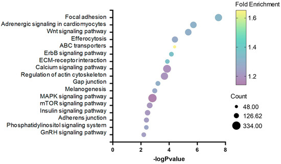 Through DMR annotation, we identified a total of 9059 differentially methylated genes (DMGs), including 2886 differentially methylated promoters (DMPs). KEGG enrichment analysis of 9059 DMGs revealed that focal adhesion, adrenergic signaling in cardiomyocytes, and Wnt signaling pathway were highly represented by cortisol action in rainbow trout skeletal muscle (Figure 4).