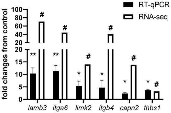 Considering that focal adhesion, ECM-receptor interaction, and the regulation of actin cytoskeleton were over-represented in all KEGG enrichment analyses, we selected six candidate genes for RT-qPCR validation. We selected lamb3 (laminin subunit beta 3) and itga6 (integrin alpha 6), both involved in ECM-receptor interaction. Limk2 (LIM domain kinase 2) and itgb4 (Integrin Subunit beta 4) are involved in the regulation of the actin cytoskeleton. Capn2 (calpain-2 catalytic subunit) and thbs1 (thrombospondin-1) are involved in focal adhesion. Our results reveal a high correlation (r = 0.9156) between the expression values of candidate genes using both RNA-seq and qPCR techniques (Figure 5).