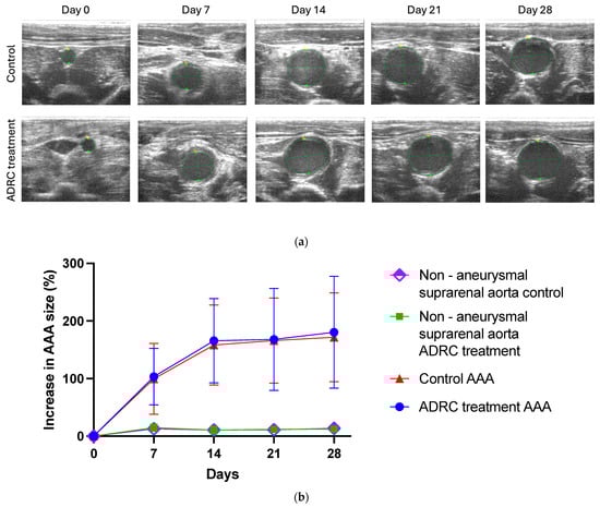 11]. If implemented in clinical practice, multiple stem cell injections would likely be necessary to halt the progression of AAA for a lifetime; thus, a single injection approach would need to be reassessed. Future studies would focus on multiple injection models. Arterial injections are avoided due to the high risk of embolization, leading to severe complications. Venous injections are the standard practice and are considered safe for patients in both current and future treatments. We acknowledge that not examining ADRCs’ homing is a study limitation, as it would have shown whether ADRCs reached the AAA wall. Since the rats were only euthanized at the experiment’s end, it is uncertain if ADRCs could be detected in the wall at that time. Additionally, the timing and duration of treatment are crucial elements. A rat study using the same PPE AAA model demonstrated a significant decrease in AAA expansion 14 days post-induction with 1 × 10