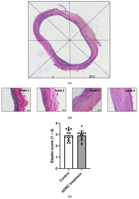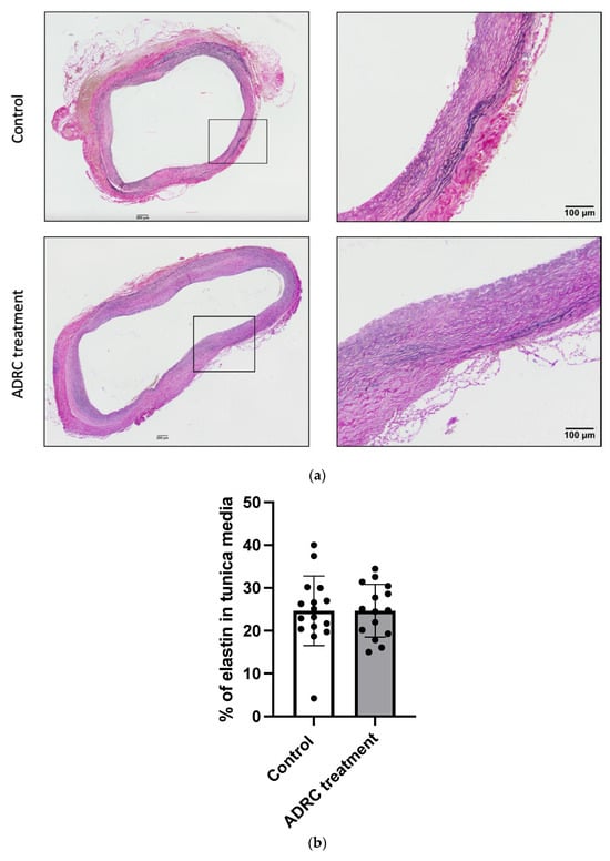 17]. An increase in elastin could have an important role in maintaining the integrity of arterial elastin, a crucial element for the prevention of AAA initiation, development, and rupture. In our study, ADRCs did not have any obvious effect on elastin content at post-surgery day 28. We cannot rule out that at an earlier time point, where inflammation is at its highest around day 7, there might have been an effect. However, based on the AAA size, it is less likely that elastin integrity would have been highly affected.