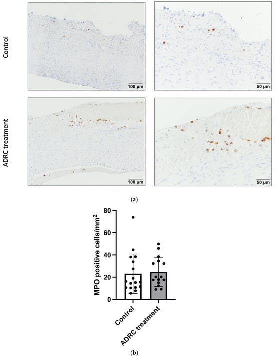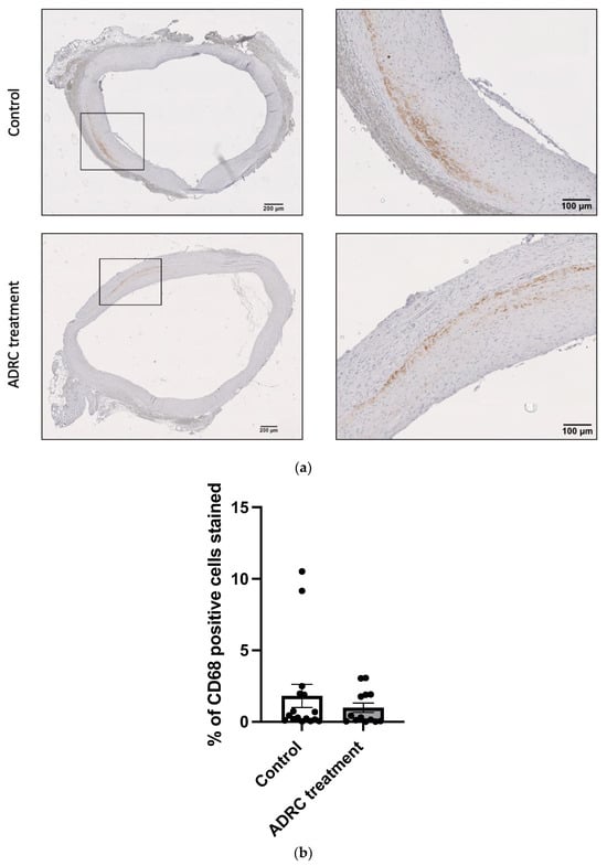 23], which could suggest that a larger number of cells is needed to be effective in AAAs. Finally, the local administration in the penis study may have allowed more time for the ADRCs to secrete paracrine factors, whereas, in our study, the systemic administration would likely cause the ADRCs to pass the affected arterial wall faster, possibly reducing the window of action.
