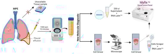 Potential algorithm that proposes the integration of the IdyllaTM Gene Fusion Panel cartridge in the evaluation of molecular alterations in pleural effusions of patients with NSCLC. (Permission was granted for Biorender the image.)