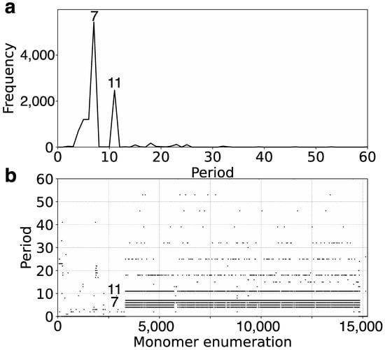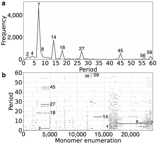 Here, we utilized the GRM2023 algorithm to investigate the recent genome assembly of orangutan chromosome 13, based on the NHGRI_mPonAbe1-v2.0_pri assembly (NCBI RefSeq assembly GCF_028885655.2), which was generated using PacBio Sequel and Oxford Nanopore PromethION sequencing technologies. Initially, tandemly organized alpha satellite monomers were identified within the genomic assembly of orangutan chromosome 13, enumerated in the order of their appearance in assembly. Using the precise GRM2023 algorithm, we computed the corresponding GRM diagram for this array of tandemly organized monomers. HORs were identified as prominent peaks in the GRM diagram: a peak of period n corresponds to n × 171 bp, representing the nmer HOR []. The GRM diagram for the complete assembly of orangutan chromosome 13 is depicted in Figure 1a. As demonstrated here, the GRM peaks at periods 7, 14, 18, 27, 45, and 59 correspond to 7mer, 14mer, 18mer, 27mer, 45mer, and 59mer HORs, respectively.