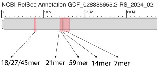 The ideogram (Figure 2) illustrates the spatial arrangement of major alpha satellite HOR arrays identified from the GRM and MD diagrams for orangutan chromosome 13 (Figure 1a,b), highlighting their distribution and relative positions within the centromeric region.