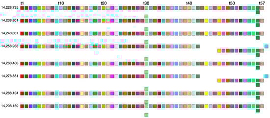Aligned scheme of a cascading 59mer HOR array consisting of six canonical 59mer HOR copies and two 56mer variants. Different monomer types are indicated by unique colors within their respective boxes. The constituent monomers, designated as t1, t2, t3, … t58, are each distinct from one another. In the MD diagram shown in Figure 1b, the MD line segment corresponds to the canonical 59mer HOR copies (period 59) and a shorter MD line segment corresponds to the 56mer variant (period 56). The two HORs at positions 14,258,933 and 14,278,551 are 56mer variant HORs that differ from the canonical due to a mutation in monomer t43 and a deletion of the triplet of monomers t44-t45-t46. The green monomer types singled out in the second and third row of each HOR copy represent duplications of monomers t56 and t30, respectively, which contribute to the cascading nature of the 59mer HOR array.