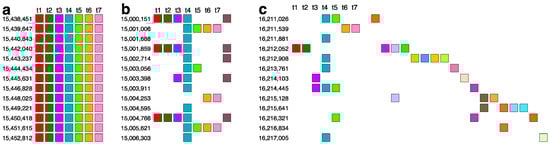 Illustrative segments from 7mer HOR array. (a) A segment containing canonical 7mer HOR copies (position from 15,438,451 to 15,452,812) in the central part of 7mer HOR array. Monomers in HOR copies are aligned according to their type. In the top row above each box, the corresponding type is labeled as t1, t2, and so forth. Different monomer types are distinguished by varying box colors, while monomers of the same type share identical coloring. This presentation of the HOR scheme is described in Ref. []. (b,c) Segments (positions from 15,000,151 to 15,006,303 and 16,211,026 to 16,217,005) with increased deletions within the alignment and increased insertions outside the alignment band. In the GRM diagram, the main peak denoted 7 corresponds to the 7mer HOR, and the peaks denoted 8, 4, and 2 correspond to subfragments with periods of 8, 4, and 2, respectively, associated with the 7mer HOR (Figure 5).