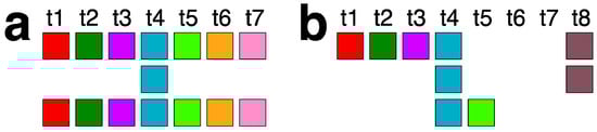 On both sides of the region dominated by canonical 7mer HOR array copies, deletions within canonical HOR copies increase, insertions become more numerous, and traces of monomer-type alignment gradually disappear, as seen in Supplementary Figure S2. This situation is illustrated by segments of the 7mer HOR copies in Figure 4b,c. In such cases, equidistant repeats appear within the 7mer HOR array corresponding to subfragments. The most pronounced subfragments in the 7mer HOR array are the 8mer, 4mer, and 2mer. In the GRM diagram, the main peak denoted 7 corresponds to the 7mer HOR, and the peaks denoted 8, 4, and 2 correspond to subfragments with periods of 8, 4, and 2, respectively, associated with the 7mer HOR (Figure 5). In addition to canonical 7mer copies, there exists a periodic substructure triplet consisting of three aligned 7mer HOR copies, represented as (t1, t2, t3, t4, t5, t6, t7)—(t4)—(t1, t2, t3, t4, t5, t6, t7) (Figure 5a). These substructures repeatedly appear at the beginning and end of the 7mer HOR array, for example, starting at positions 16,013,745, 16,015,309, and 16,017,871 (Supplementary Figure S2). Within each substructure, an eight-step periodicity (t1→t2→t3→t4→t5→t6→t7→t4→t1) generates a pattern of period 8, leading to an associated equidistant 8mer subfragment pattern. This periodicity is consistent even if initiated from t2, t3, t5, t6, or t7, thereby synchronizing to produce the MD frequency of period 8, as documented in Table 1. Conversely, initiating from t4 in the same periodic substructure triplet (t4→t5→t6→t7→t4) results in a 4mer subfragment structure. Similarly, a 2mer subfragment pattern (t4→t8→t4 and t8→t4→t8) (Figure 5b) emerges within a periodic substructure of four aligned 7mer HOR copies, structured as (t1, t2, t3, t4, t8)—(t4, t8)—(t4, t8)—(t4, t5) at the beginning of the 7mer HOR array. There are also some other less pronounced periods partially present in the monomer enumeration region of the 7mer HOR array, as shown in Figure 1b; these are mostly constituted of distinguishable MD points at different periods.
