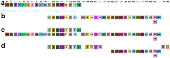 Using our GRM2023 algorithm, we identified three interspersed HOR patterns: 18mer, 27mer, and 45mer, fully presented in Supplementary Figure S3. Their aligned canonical HOR copy schemes are shown in Figure 6a–c, respectively. The consensus sequence of the 18/27/45mer canonical HOR copy is provided in Supplementary Table S3. The intermixing of the three HOR patterns is summarized in Figure 7. As illustrated, the 18mer HOR copies are almost compact. Additionally, segments of the 18mer are incorporated as structural parts into every 27mer and 45mer copy (Supplementary Figure S3), as illustrated in Table 2.