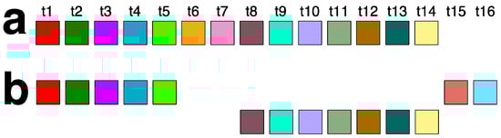 Schemes of canonical and variant 14mer HOR copies. (a) Canonical 14mer HOR copy. (b) Variant 14mer HOR copies arising from canonical HOR copy by substituting two monomers of types t6 and t7 with monomers of types t15 and t16. This substitution occurs four times in the 14mer HOR array, resulting in four identical variant HOR copies (Supplementary Figure S4).
