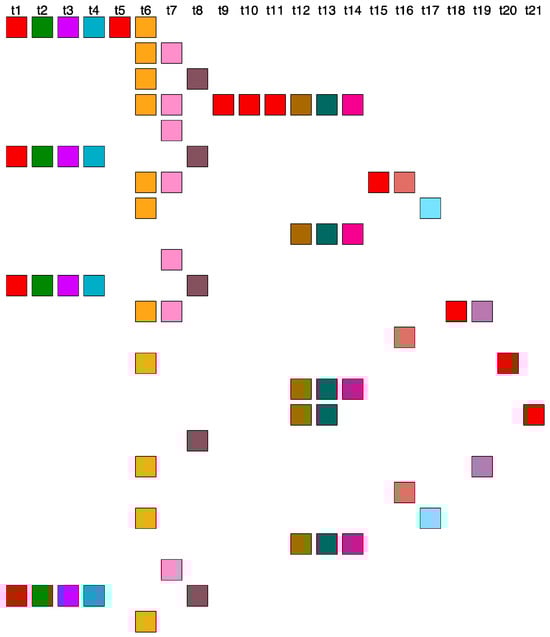 A highly distorted pattern is observed, comprising monomers aligned in a scheme of 21 different types. The monomers are scattered yet aligned, preventing the identification of a canonical HOR copy (Figure 8). This intricate scheme is characterized by the alignment of monomers according to their types. We emphasize that this is not a true 21mer; rather, it consists of 21 different types of monomers combined into various variant HOR copies, none of which are 21mers, but are instead 19mers, 15mers, and 28mers (Figure 8).