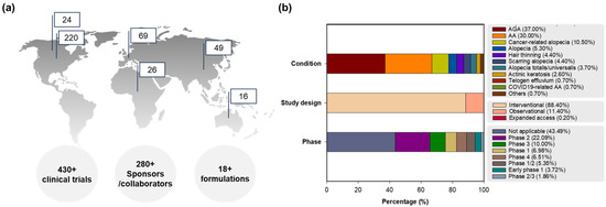 Clinical trial information for hair loss: (a) global clinical trial registrations on the map (Top 6 regions) with segmentation by numbers of total clinical trials, sponsors/collaborators, and formulations, (b) percentages of clinical trials classified by conditions, phases and study designs. Abbreviations: AA, alopecia areata; AGA, androgenetic alopecia; COVID-19, coronavirus disease 2019.