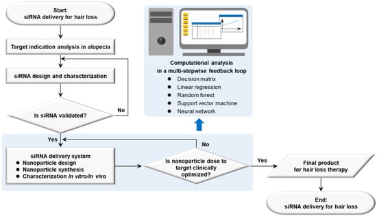 Therapeutic target-based delivery strategies for hair loss are exemplified in a framework successfully dealing with barriers for organs or tissues, cells, and organelles to minimize the off-target losses and to maximize the on-target path [20]. Using a decision matrix, a linear regression, a random forest, a support vector machine, and a neural network in the computational analysis, a rational guided strategy can be a multi-stepwise feedback loop. First of all, it is processed to analyze the biology of target indications in diseases and to set up nanoparticle doses to target an organ. Next, the research data are repeatedly input into a computational algorithm, released from the nanoparticle design, synthesis, and characterization in vitro and in vivo (e.g., cell culture, and animal models). An adjuvant function is eventually used to modulate biological environments at diseased sites or delivery pathways (Figure 5). Small molecules targeting RNA structure can also be added into the research framework with a tight validation of siRNA [206]. The nanoplatform development framework raises issues that must be resolved involving the quality criteria of QTPPs for hair loss therapy, categorized by delivery targets, active agents or cargo, manufacturing process, site of administration, delivery pathway, interaction in the body, and elimination [207] (Table 3).