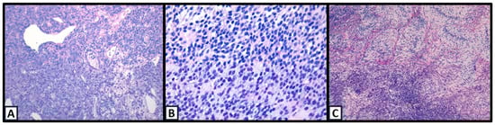 (A) H&E biphasic SS with glandular formation (40×); (B) H&E undifferentiated SS (40×); (C) H&E fusiform SS with Verocay Body-like structures (10×).