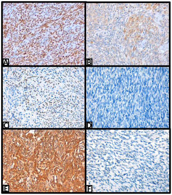 All the available H&E slides were examined by four pathologists (F.G., E.M.-C., I.M., and A.L.-B.), all blinded to the clinical data. In cases of disagreement, a consensus was reached on a multi-head microscope. SS diagnosis was established according to World Health Organization (WHO) criteria, classifying SSs as monophasic, biphasic, or poorly differentiated []. The most representative areas of each tumor were chosen for inclusion within tissue microarrays.