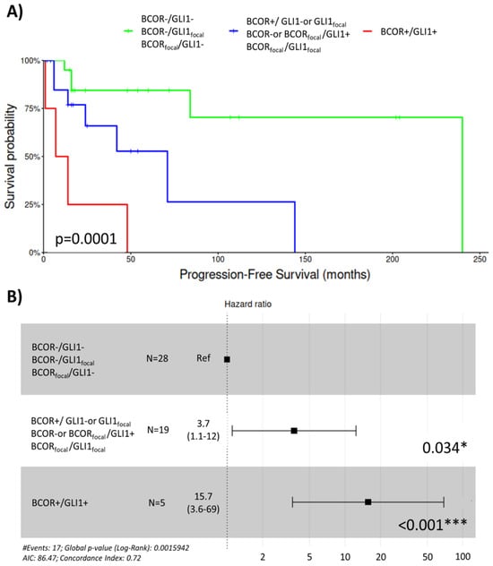 The prognostic significance of IHC protein expression was evaluated with log-rank testing (Supplementary Table S3). In this regard, BCOR (p = 0.0024) and GLI1 (p = 0.0037) proteins had an impact on PFS (Figure 4). BCOR expression also showed a correlation with OS (p = 0.011). Positive expression of both proteins, BCOR (HR = 7.1, 1.92–26; p = 0.003) and GLI1 (HR = 8, 1.91–33.8; p = 0.004), was correlated with a worse prognosis. Multivariate analysis was also performed, but only BCOR appeared to be significant.