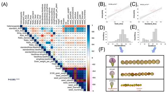 Correlation analysis and analysis of the petal phenotype and seed phenotype. A petal trait GWAS. (A) Pearson correlation analysis of the petal phenotype and seed phenotype in natural populations; red represents a positive correlation, blue represents a negative correlation; *** denotes a correlation p value < 0.001. (B) Scatter plot of the vexil area and seed area correlation analysis. (C) Scatter plot of the standard area and seed area correlation analysis. (D) Standard area phenotypic data frequency distribution histogram. (E) Seed area phenotypic data frequency distribution histogram. (F) Samples were selected according to the size of the seed area and standard area phenotype, and the corresponding relationship between grains and petals was observed. The red line represents the 1 cm reference line.