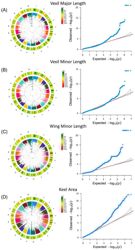 Genome-wide association analysis of petal phenotypes in the soybean natural population, featuring Circular Manhattan plots and QQ plots. In each Manhattan plot, the red line signifies the threshold. (A) Vexil major length was analyzed using the MLM model. (B) Vexil minor length was also analyzed using the MLM model. (C) Wing minor length underwent analysis through the MLM model. (D) The keel area was analyzed using the MLM model.