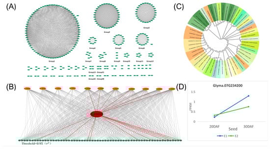 The interaction between significant SNPs identified in both the seed and petal GWAS results was examined. The analysis (Supplementary Table S4) utilized a threshold of ≥0.95. Subsequently, an interaction network diagram was constructed using Cytoscape, illustrated in Figure 3A. The 936 SNPs were categorized into 49 interaction networks. Further, a Bipartite graph (Figure 3B) was generated for Group 1 of the candidate genes shown in Figure 3A, with the SNP locus of the candidate gene Glyma07G234200 highlighted. Notably, this locus interacts with significant SNPs from both the seed and petal GWAS results, indicating potential shared genetic regulation of the two phenotypes. The candidate gene Glyma07G234200 was involved in this interaction. Additionally, a phylogenetic tree analysis of candidate genes across various crop species, including O. Sativa, Z. mays, G. soja, and Glycine max, revealed homologous genes of Glyma07G234200 in multiple crop species (Figure 3C). Moreover, RNA-seq data analysis revealed differential expression patterns of Glyma07G234200 in large-grain sample E1 and small-grain sample E2 at various stages (Figure 3D), suggesting their involvement in promoting organ development during growth.