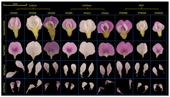 In the present study, soybean flowers were meticulously disassembled post-extraction. Subsequently, the dissected parts were categorized into a vexil petal ×1, a wing petal ×2, and a keel petal ×2 for individual imaging (refer to Figure 6) [63]. Observation and photography of soybean flowers were conducted utilizing a three-eye microscope (ZS7050, LANGQI, Beijing, China) boasting a resolution of 48 MP. Petals were captured alongside a white reference point measuring 1 cm in diameter. The imaging setup included DEEP studio and DEEP light (SQ054, DEEP, Hangzhou, China). Seed phenotypes were assessed using a specialized machine (SC-G, Wseen, Hangzhou, China), with measurements encompassing seed length, width, average area, and average perimeter. Each variety underwent three measurements, and the results were averaged for analysis.