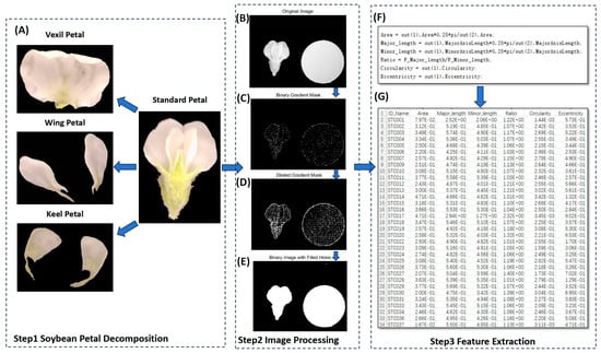 In the present study, MATLAB (V 2022) was utilized to process petal images, as illustrated in Figure 7. The process entailed several key steps. (1) Binary Gradient Mask: The object to be segmented exhibited significant contrast differences from the background image. Operators calculating image gradients can detect changes in contrast. A binary mask containing the segmented soybean flower was generated by computing the gradient image and applying a threshold. The edge function and Sobel operator (in MATLAB V 2022) were utilized to determine the threshold value. Fine tuning of the threshold value and subsequent application of the edge function produced a binary mask containing segmented cells. (2) Dilated Gradient Mask: The binary gradient mask displayed high-contrast lines in the image, yet these lines did not precisely delineate the object’s outline. Gaps were present in the lines surrounding the object within the gradient mask when compared to the original image. These linear gaps could be filled by dilating the Sobel image using linear structuring elements. Two perpendicular linear structuring elements were created using the strel function in MATLAB. The binary gradient mask was dilated sequentially using the vertical and horizontal structuring elements. The imdilate function (in MATLAB) was employed for image dilation. (3) Binary Image with Filled Holes: While the dilated gradient mask provided a clear outline of the flower, there were still interior holes within the cell. These holes were filled using the imfill function in MATLAB [64]. Six phenotypes (length, width, area, perimeter, eccentricity, ratio, circularity) were extracted from the processed images of each petal type (Figure 8). A total of 24 petal phenotypic datasets, including standard (Figure 8B), vexil (Figure 8A), wing (Figure 8E), and keel (Figure 8C) petals, were obtained.