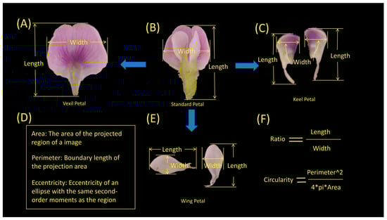 Specific quantitative indicators of the morphological phenotypes of soybean flowers. (A) Vexil petal length and width example. (B) Standard petal length and width example. (C) Keel petal length and width example. (D) Area, perimeter, and eccentricity explanation. (E) Wing petal length and width example. (F) Ratio and circularity calculation description.