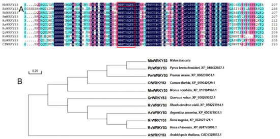 Analysis results of amino acid sequences for MbWRKY53 and other WRKY proteins (A), as well as phylogenetic tree analysis (B). Note: The target protein is marked with a red underline, and the WRKY domain is represented by a red box.