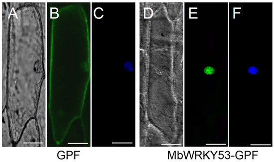 The fluorescent distribution of MbWRKY53-GFP under confocal microscopy is shown in Figure 3. In Figure 3B, it can be observed that the green fluorescence of GFP was distributed throughout the entire cytoplasm, while in Figure 3E, only the green fluorescence of the MbWRKY53-GFP fusion protein was observed in the cell nucleus. The position of the nucleus was confirmed by staining with 4′,6-diamidino-2-phenylindole (DAPI), as shown in Figure 3F. Therefore, it can be demonstrated that the MbWRKY53 protein was a nuclear protein.