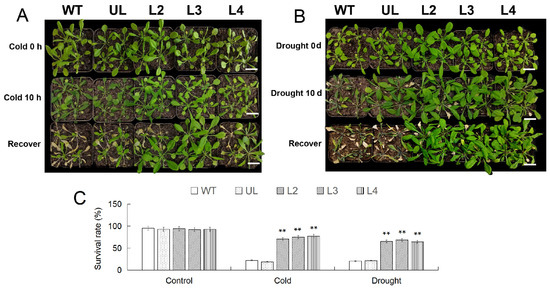 The phenotypes of Arabidopsis before and after 10 h of low-temperature treatment and after 7 d of recovery at room temperature (A); the phenotype of Arabidopsis after 10 d of drought treatment and 7 d of recovery under normal conditions (B); changes in survival rate of Arabidopsis (C). The length of the scale in the figure represents 3 cm (Bar = 3 cm). ANOVA compared the difference in survival rate between CK and transgenic lines (** p ≤ 0.01); the survival rate of WT was used as a control.