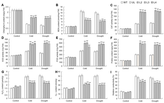 Changes in physiological indicators of WT, UL, and MbWRKY53-OE lines before and after treatment with cold and drought stress: (A) chlorophyll content; (B) MDA content; (C) CAT activity; (D) SOD activity; (E) POD activity; (F) proline content; (G) H2O2 content; (H) O2− content and (I) relative conductivity. All data are the average of 3 repetitions; ANOVA compared the differences in relevant physiological indicators among the transgenic lines, UL, and WT (** p ≤ 0.01), which are parameters in WT used as controls.