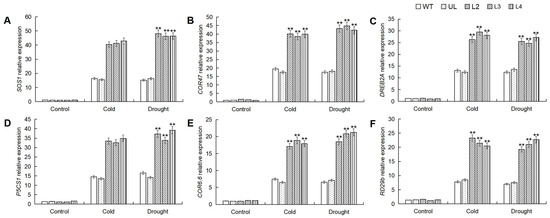 Analysis of the expression levels of target genes related to cold and drought in the WT, UL, and MbWRKY53-OE Arabidopsis lines before and after treatment with cold and drought: (A) SOS1; (B) COR47; (C) DREB2A; (D) P5CS1; (E) COR6.6, and (F) PD29b. Data represent means and standard errors of three replicates; ANOVA compared the differences in gene expression levels among the transgenic lines, UL, and WT (** p ≤ 0.01); gene expression levels in WT were used as controls.