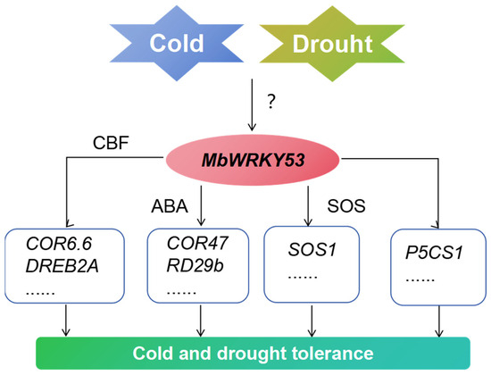 Based on previous studies and the results of this study, we have described a possible pathway by which MbWRKY53 regulates plant response to low temperatures and drought stress (Figure 8). After receiving low-temperature and drought stimuli, the expression level of MbWRKY53 increases. Then, by binding to cis-acting elements of CBF or participating in ABA synthesis and SOS pathways, it activated and upregulated the expression of these related genes, improving the survival ability of plants in low-temperature and drought environments.