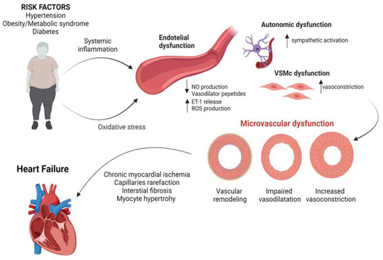 Heart failure (HF) represents a complex and multifaceted clinical syndrome with a substantial global health burden worldwide [1,2]. An estimated 64.3 million people are currently dealing with heart failure [1]. In Western countries, the prevalence of this condition is around 1% and 2% but is estimated to continuously increase in the next few decades, especially because of an increasing and aging population. Coronary artery disease (CAD) is still the leading cause underlying HF in Western countries [1]. However, while more attention has traditionally been devoted to epicardial CAD, emerging research underscores the pivotal role of coronary microvascular dysfunction (CMD) in the pathogenesis and evolution of this clinical syndrome, especially heart failure with preserved ejection fraction (HFpEF) [3,4,5,6,7,8]. CMD refers to a spectrum of changes in the structure and function of coronary microcirculation, causing reduced coronary blood flow (CBF) and ultimately resulting in myocardial ischemia, fibrosis and remodeling [3,7,9]. Despite the emerging pathophysiological and prognostic role of CMD, there is no specific treatment to date addressing this condition. Moreover, the invasive and non-invasive diagnosis of CMD is still challenging. This narrative review aims to explore the molecular mechanisms underlying CMD, and its distinct manifestations across the spectrum of HF pathology, discussing novel therapeutic targets and remaining knowledge gaps in the field.