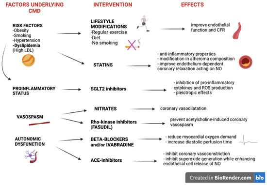 As mentioned above, patients affected by CMD and HFpEF typically suffer from numerous comorbidities and risk factors. Lifestyle modifications including regular exercise, weight management, and smoking cessation are fundamental to improving endothelial function and have been shown to ameliorate the coronary flow reserve, with beneficial effects on exercise capacity and cardiovascular outcomes [3,51,52,53,54,55].