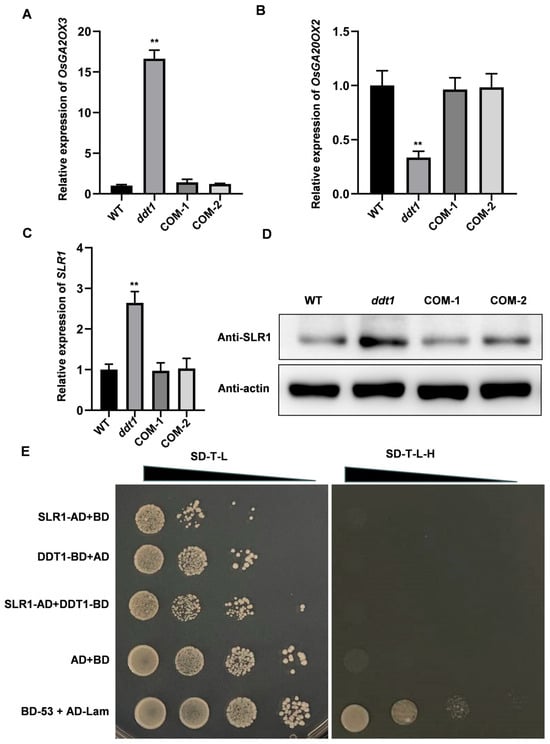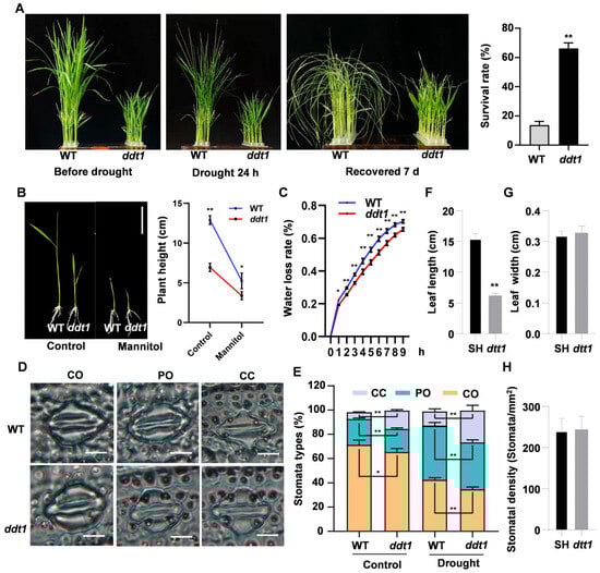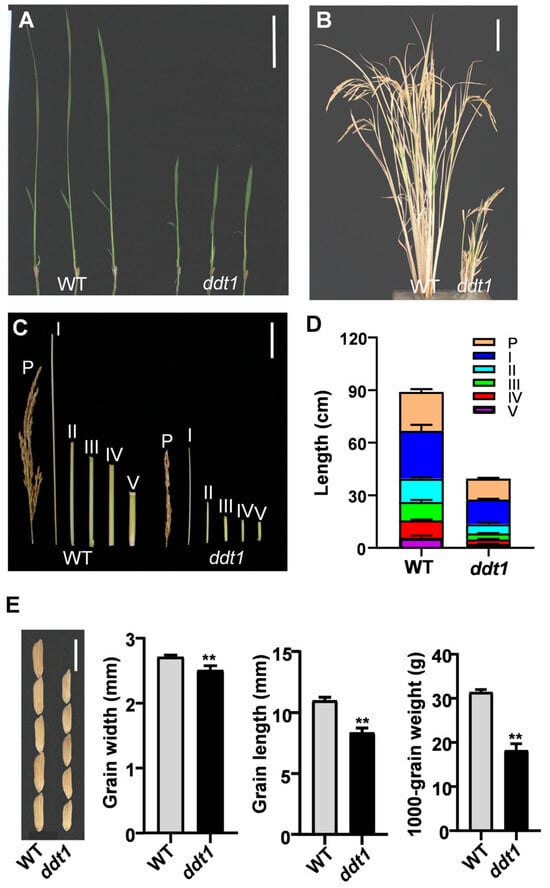 Ruan, B.; Jiang, Y.; Ma, Y.; Zhou, M.; Chen, F.; Zhang, Y.; Yu, Y.; Wu, L. Characterization of the ddt1 Mutant in Rice and Its Impact on Plant Height Reduction and Water Use Efficiency. Int. J. Mol. Sci. 2024, 25, 7629. https://doi.org/10.3390/ijms25147629