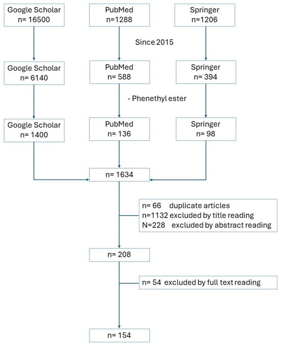 The literature review was conducted across multiple databases, including Google Scholar, PubMed, and Springer (Figure 2). Initially, a search was conducted using keywords such as caffeic acid, chemoresistance, adjuvant, biosynthesis, and metabolism. Subsequently, additional terms like inflammation and molecular targets were combined with caffeic acid for a more comprehensive search. The literature exploration involved examining the bibliographies of selected publications featuring original research to compile this review article.