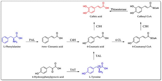 CA is synthesized via the phenylpropanoid pathway, which originates from the amino acids phenylalanine or tyrosine. Tyrosine undergoes a two-step conversion process to produce p-coumaric acid, initially catalyzed by the enzyme tyrosine ammonia-lyase (TAL). Subsequently, p-coumaric acid is transformed into CA by 4-coumarate 3-hydroxylase (C3H), which introduces a hydroxyl group at position 3. Another route involves the conversion of p-coumaric acid to coumaroyl-CoA by 4-coumarate (i.e., CoA ligase (4CL)), followed by m-hydroxylation by C3H to yield caffeoyl-CoA. The hydrolysis of caffeoyl-CoA by CoA thioesters results in the production of caffeic acid and CoA [19]. The enzymes involved in this biosynthetic pathway have been elucidated through knockout mutations and RNAi-mediated studies in Arabidopsis plants, facilitating the identification and functional characterization of key genes and enzymes [20,21]. Figure 3 shows a schematic representation of the biosynthetic pathway.