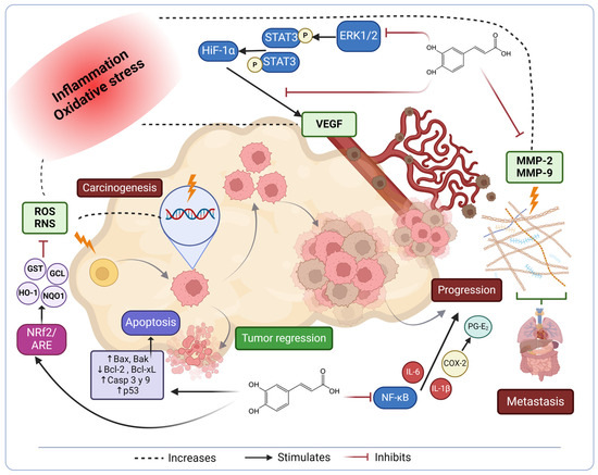 As mentioned in the previous section, chronic inflammation has been linked to the initiation and progression of cancer [88,89,90]. ROS and RNS, generated during inflammation, can inflict DNA damage, potentially leading to mutations that contribute to the maintenance of tumors [91,92]. Chronic inflammation often triggers cellular proliferation as part of tissue repair mechanisms, inadvertently creating conditions favorable for the expansion of cells with damaged DNA or mutations, thus heightening cancer risk. Moreover, inflammation has been implicated in cancer progression by promoting the production of inflammatory cytokines that support cell proliferation, inhibit apoptosis, stimulate tumor angiogenesis and vascularization, and facilitate tumor invasion and metastasis.