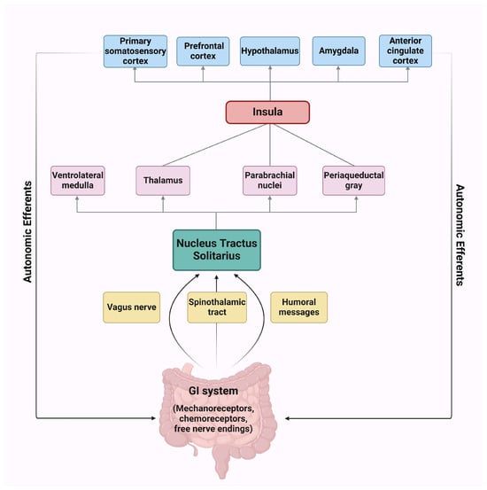 Similarly to IBS, the pathophysiology of the other FGIDs has not yet been fully elucidated. However, they are now considered disorders of gut–brain interactions, and visceral hypersensitivity seems to play a crucial part in their pathogenesis []. Our search showed that data regarding the role of interoception in other functional gastrointestinal disorders’ pathophysiology are rather sparse. A recent fMRI study in adult patients with Functional Dyspepsia (FD) revealed that they display increased connectivity of the nucleus tractus solitarius (NTS) with regions of the broader interoceptive network, including the insula, the anterior cingulate cortex, and the prefrontal cortex, and a shift of connectivity from the default mode network to the executive control network compared to healthy controls. Furthermore, this connectivity pattern was associated with antral peristaltic frequency []. The NTS is the major integration center of visceral input, while the anterior insula is involved in attention to interoceptive stimuli, and these findings suggest that patients with FD display increased attention to distressing gastric interoceptive stimuli and probably employ an altered pattern of cognitive control to cope with interoceptive stimulation [].
