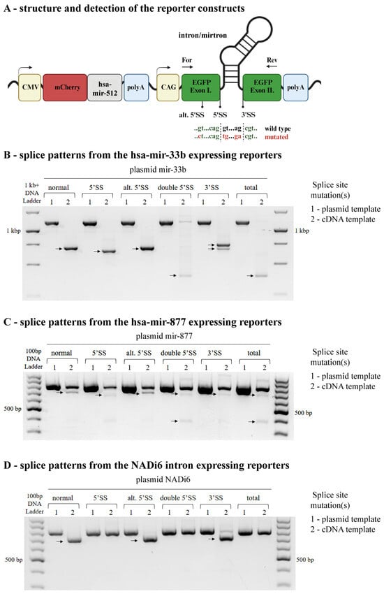 The structural details and constraints of mirtron processing and its strict dependence on splicing are still not fully understood, especially in light of the fact that intronic miRNAs represent the predominant types among intragenic miRNAs []. It was shown earlier that for long introns containing pre-miRNAs, the Microprocessor complex can remove the precursor miRNAs from the transcript even if splicing is inhibited []. In the case of mirtrons, however, mutations in the flanking splice sites still render the mirtronic pre-miRNA inaccessible for Drosha cleavage []. The question arises whether it is caused by a steric hindrance of a strong secondary structure, by the short hairpin structure that is suboptimal for Drosha processing, or rather by a strongly associated RNA binding protein (such as a still present splicing factor) that could prevent Microprocessor activity on a mirtronic locus. Another important but unexamined aspect is the mirtronic “behavior” connected to alternative splicing; if nearby alternative splice sites exist, they may initiate tailed mirtron formation, which could rescue the mirtron processing pathway when the major splice sites are mutated. With 5′ tailed mirtrons predicted to be more abundant than even conventional mirtrons [], this issue merits further investigations. To address this problem, we used EGFP-based reporter assays to investigate the effects of alternative splice sites on canonical and mirtronic miRNA formation in the absence of the major cis-acting splicing elements. We inserted different artificial introns into the EGFP coding sequence and generated 5′ and 3′ splice site (SS) mutations (individually or in combination) to measure miRNA expression from such loci. In many cases, the mutations resulted in the appearance of various alternative splice products that had no negative effect on canonical miRNA formation from a longer intron. In the case of a mirtronic intron, however, disrupting the major splice sites abolished miRNA formation from both pre-miRNA arms, although to a different extent. Our results support the model where the major splice site mutations at a mirtron locus strictly prevent miRNA formation, even if weak alternative splice sites are used in the nearby flanking regions.