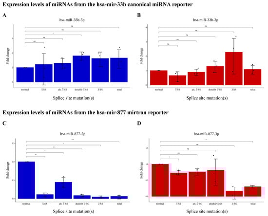 Relative expression levels of the (A) hsa-miR-33b-5p and the (B) hsa-miR-33b-3p, or the (C) hsa-miR-877-5p and the (D) hsa-miR-877-3p miRNA species expressed from the corresponding reporter constructs. Mean values of three independent biological experiments are shown, the black dots indicate the results of individual experiments; error bars represent the 95% confidence intervals. ns: not significant; *: p < 0.05; **: p < 0.01; ***: p < 0.001.