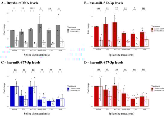 The crucial difference between the canonical and mirtronic pre-miRNA formation is the dependence on the Microprocessor complex and, most importantly, on its central component, the Drosha endonuclease. To investigate this factor in our system, we generated siRNA knockdown of Drosha in the cells and tested miRNA formation from our splicing reporters. The efficiency of the knockdown was indicated by the significant reduction of Drosha mRNA levels (Figure 4A) and functionally proven by the significantly lowered canonical miRNA species, the hsa-miR-512 control from our vector constructs (Figure 4B). On the other hand, neither the 5p nor the 3p arm species of the hsa-miR-877 mirtron showed a decreased expression in the Drosha knockdown experiments, and their levels were still solely determined by the active or mutated statuses of the canonical splice sites (Figure 4C,D). These results suggested that the alternative 5′ SS did not initiate the formation of an efficient 5′-tailed mirtron, and the biased effect detected on the mirtron-derived 5p or 3p miRNA species were the results of Drosha-independent mechanism(s).