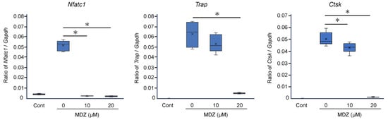 Effect of MDZ on the expression of osteoclast differentiation marker genes in RAW264 cells. RAW264 cells were cultured in the absence of RANKL and MDZ (Cont) or in the presence of 300 ng/mL RANKL together with MDZ (0, 10, and 20 μM). Nfatc1: nuclear factor of activated T cells 1; Trap: tartrate-resistant acid phosphatase; and Ctsk: cathepsin K. The level of each mRNA was normalized to that of the reference gene glyceraldehyde-3-phosphate dehydrogenase (Gapdh), and the relative quantification data for Nfatc1, Trap, and Ctsk mRNA levels in RAW264 cells were generated based on a mathematical model for relative quantification in the qPCR system. The asterisk (*) indicates a significant difference in values between each concentration of MDZ (* p < 0.05, Steel–Dwass test). MDZ: midazolam.